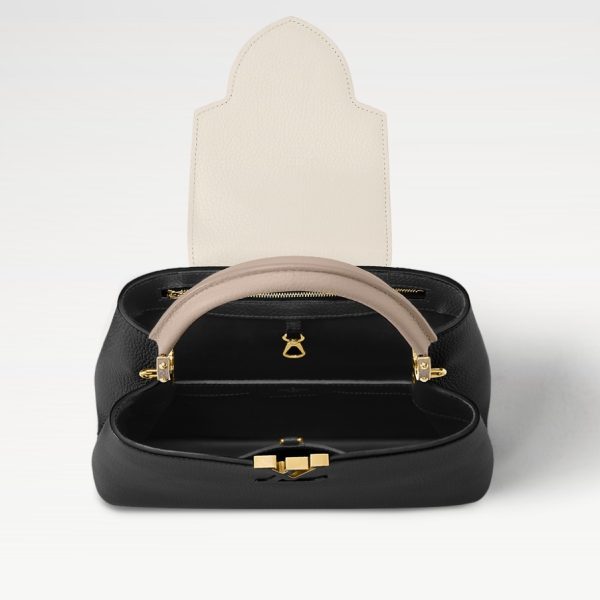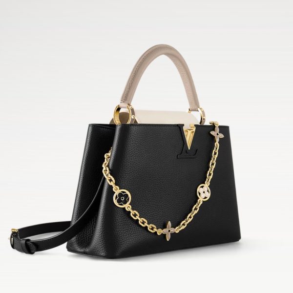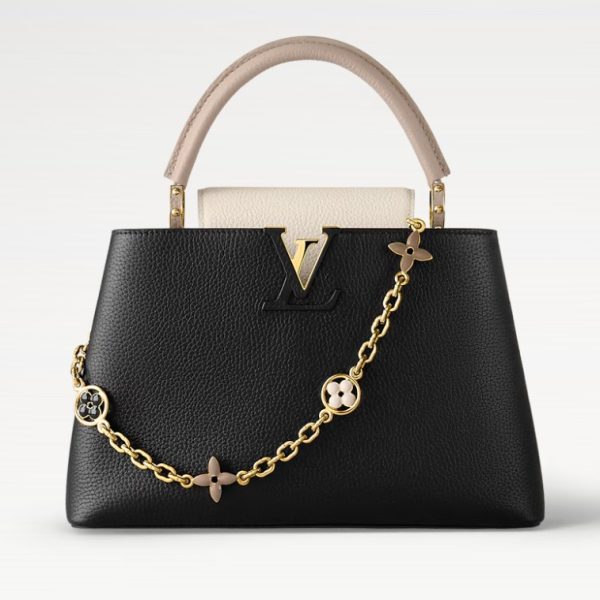 - This season, Louis Vuitton reinvents the Capucines MM bag, bringing a precious gold-tone chain adorned with colourful enamel Monogram Flowers to this classic bag. The polishing of each metallic flower is done by hand as is the enamel injection of the colours. A thin, adjustable and removable strap enables various carrying options.