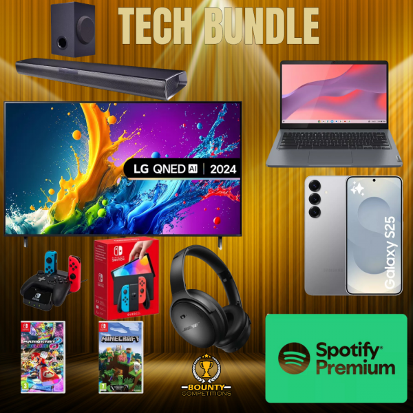 LG QNED80 55 inch QNED 4K HDR Smart TV (2024) - 55QNED80T6A LG SQC1 2.1 Wireless Compact Sound Bar SAMSUNG Galaxy S25 - 128 GB, Silver Shadow LENOVO IdeaPad Slim 3 14" Chromebook & Sleeve - Intel® Core™ i3, 128 GB eMMC, Storm Grey NINTENDO Switch OLED Neon Red & Blue, Mario Kart 8 Deluxe, Minecraft & Charging Station for Controllers Bundle BOSE QuietComfort SC Wireless Bluetooth Noise-Cancelling Headphones - Black SPOTIFY Premium Digital Gift Card - 12 monthsEntries