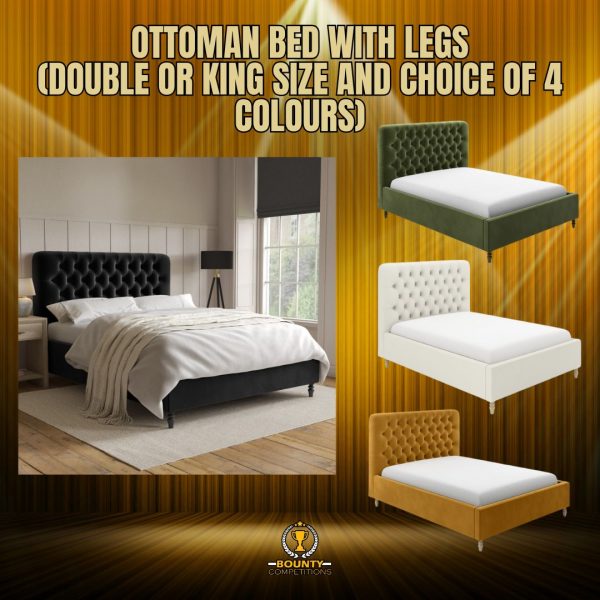 Ottoman Bed with Legs (winner can choose from Double or King Size) Add a pop of colour to any modern bedroom with the Pippa ottoman bed. The solid light wood turned legs add a traditional touch. The end-opening ottoman is easy to access, and the fabric-lined base protects your stored items. It features a sprung-slatted base for ultimate comfort. Choose from Mustard Velvet, Olive Green Velvet, Black Velvet or Cream Fabric King size Dimensions: W162 x D216 x H126 cm, Double Dimensions: W147 x D206 x H126 cm Memory Foam Top 1500 pocket Sprung Hybrid Mattress (Medium Firm)